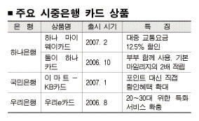 연초부터 은행권의 카드시장 ‘공습’이 시작되고 있다. 은행권의 가장 큰 ‘무기’는 막대한 자금력. 몇 년 동안 사상 최대의 호황을 안겨줬던 주택담보대출 대신 신용카드 시장을 새로운 수익원으로 삼겠다는 것이다.TV 광고 예산도 대폭 늘렸다.