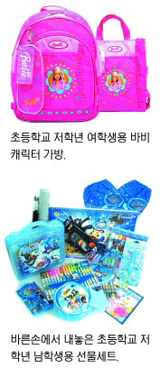 G마켓(www.gmarket.co.kr)은 딸기 캐릭터, 신발주머니, 책가방 등으로 구성된 세트 상품을 3만 4000∼3만 8000원에, 헬로키티 책가방 세트를 4만 7000원에 내놓았다. 휠라의 인기상품인 9만 3000원짜리 가방은 2만 8000원(균일가)에 판다.