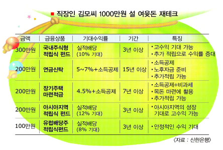 신한은행 관계자는 “ELS펀드는 원금 보전을 추구한다는 점 때문에 안정성과 수익성을 모두 기대할 수 있고, 수익률도 7∼16% 정도로 투자 ‘새내기’에게도 적당한 상품”이라면서 “비과세와 소득공제 혜택을 받을 수 있는 장기주택마련저축, 연금저축, 세금우대예금 등도 여유자금 저축에 적당하다.”고 설명했다.