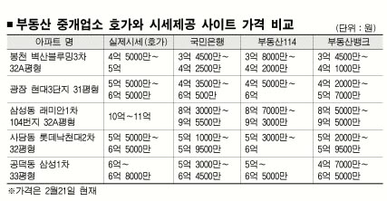 구모(36·회사원)씨는 최근 부동산시세 사이트에서 아파트 가격을 알아본 뒤 중개업소를 찾았다가 헛탕만 쳤다. 직접 현장에 가보니 그 비슷한 가격의 물건도 없었다. 구씨가 알아본 서울 광진구 광장현대3단지 31평형은 하한가 기준 부동산뱅크는 4억 2000만원, 국민은행은 4억 3500만원, 부동산114는 4억 5000만원이었다. 현장에 가니 실제 매물은 이들보다 1억원 이상 비싼 5억 5000만원이었다. 건설교통부 홈페이지에서 실거래가를 제공하지만 지난해 9월 기록이 최신이어서 도움은 되지 못했다.
