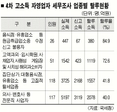 국세청이 26일 공개한 4차 고소득 자영업자에 대한 세무조사 결과 적발된 탈루실례이다. 게임 등 정보산업(IT)업계가 급성장하면서 IT업종의 탈루사례가 여러 건 적발됐다.