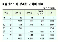 카드를 갖고도 1년간 사용하지 않은 사람은 2004년 835만명,2005년 1088만명,2006년 1195만명 등으로 해마다 느는 추세다. 이 가운데 연회비를 거둬들인 회원은 2004년 102만명,2005년 110만명 등 10%에 이른다. 이에 따라 카드사들이 무실적 회원으로부터 챙긴 연회비도 2004년 56억원 2005년 62억원 등으로 증가하고 있다.
