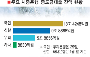 국민, 우리, 신한, 하나 등 주요 시중은행의 집단담보대출 가운데 중도금 대출 잔액은 현재 30조원 정도.277조원 정도인 전체 주택담보대출의 10%를 조금 넘는 수치다. 이 가운데 국민은행이 절반에 가까운 13조 4248억원을 대출해주고 있다.