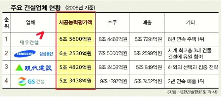지난해 7월 시공능력 평가에서 처음으로 정상에 오른 대우건설의 수성 의지도 만만찮다. 대우건설은 지난해 업계에서 유일하게 아파트 1만가구 이상을 공급했다. 또 6년 연속 주택업계 1위와 4년 연속 주택부문 매출 1위,2년 연속 주택부문 수주 1위를 내세우고 있다. 대우는 올해 수주액 9조 8000억원, 매출액 6조 2870억원을 달성해 업계 정상을 굳힌다는 전략이다. 대우건설 관계자는 “올해는 금호건설과의 시너지 효과를 극대화해 1위 자리를 굳히겠다.”고 말했다.