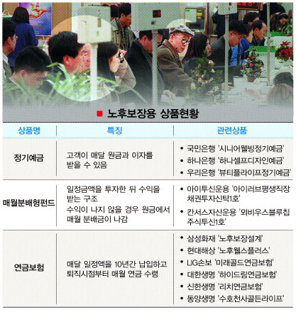 하나은행의 ‘하나셀프디자인예금’은 최장 31년까지 매월 자신이 필요한 돈을 받을 수 있는 상품이다. 신규가입 때 1억원을 넣고 만기 3년, 금리 4.9%, 만기시 수령액 5000만원으로 디자인하면 3년간 매월 164만원을 받는다.1년 정도 지나 생활비가 더 필요하면 만기수령액을 2000만원으로 줄이고 월수령액을 284만원으로 늘리면 된다. 우리은행의 ‘뷰티플라이프 정기예금’은 돈을 받는 시기를 1개월,3개월,1년 단위로 바꿀 수 있다. 돈을 맡기기만 하는 거치기간이 최장 3년까지 가능해 보다 효율적인 자금운용이 가능하다. 거치기간에는 연 4.6%의 금리가 적용된다. 국민은행의 ‘웰빙시니어통장’의 경우 자녀가 만 50세 이상 부모에게 매월 용돈을 주는 형태로도 가입할 수 있다. 은행권의 노후통장에 가입할 경우에는 보험상품 무료가입, 헬스케어서비스 등 부대서비스도 있는 만큼 꼼꼼히 따져보고 가입하는 것이 있다.