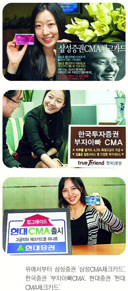 대신증권은 4월 중에 롯데카드와 업무제휴협약을 맺고 오는 4월 중 CMA체크카드 상품을 출시할 예정이다. 연 4%대의 확정이자를 받으면서 은행 보통예금처럼 편리한 금융거래를 할 수 있는 대신 CMA를 판매하고 있다. 한국증권의 ‘한국증권 부자아빠CMA’는 운용 대상을 고수익RP에 투자해 하루만 맡겨도 연 4.3%를 받을 수 있다.