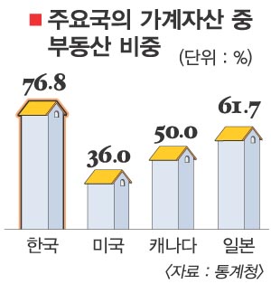 캐나다(2005년)는 부동산 비중 50%, 금융자산 39.4%였다. 일본(2004년)의 경우도 부동산과 금융자산이 각각 61.7%,34.9%로 우리나라보다 부동산 쏠림 현상이 덜했다.
