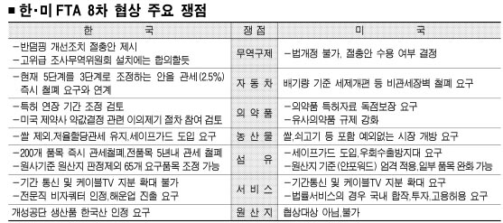 한·미 자유무역협정(FTA) 협상이 9부 능선을 넘었다.8일부터 12일까지 서울 하얏트호텔에서 열리는 8차 협상에서는 무역구제와 자동차·의약품 등 3대 핵심쟁점과 농산물·개성공단 문제, 기간통신사업자 외국인 지분제한 등 일부 서비스분과 쟁점을 포함한 민감한 분야를 제외하고는 대부분 쟁점들에서 합의를 이뤄낼 전망이다.