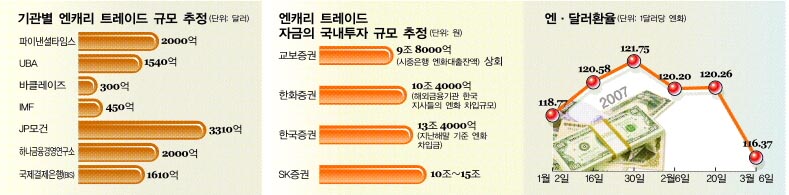 세계 금융시장의 관심을 끌고 있는 엔캐리트레이드(yen-carry trade) 자금이 조금씩 일본으로 돌아가고는 있지만 크게 우려할 사항은 아니라고 증시 전문가들은 진단했다. 점진적일 것이며 주식 등 위험자산을 피하는 경향으로 국내에 일부 충격이 있을 수 있지만 원·엔환율 상승으로 수출경쟁력이 높아지는 긍정적 효과도 기대된다고 전망했다. 주식시장보다 부동산 시장을 예의주시해야 한다는 목소리도 나왔다.