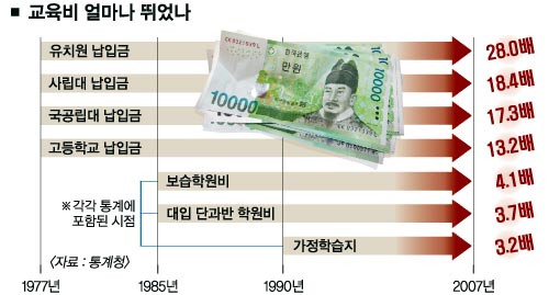 아이들 가르치기가 갈수록 힘들어진 이유가 지난 30년간의 장기 물가변화 추이에서 그대로 드러났다. 올해 유치원 납입금이 1977년의 28배에 이르는 등 30년간 농수산물을 빼고는 교육 물가의 상승폭이 가장 컸다. 사립대 납입금과 국·공립대 납입금도 각각 18.4배와 17.3배로 상승했다. 같은 기간 전체 물가가 5.8배 오른 것을 감안할 때 압도적인 증가폭이다.