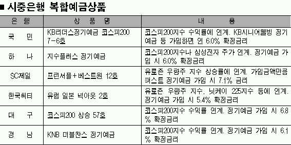 이밖에 경남은행 등 지방 은행들도 코스피200지수의 수익률과 연계된 복합형 상품을 판매하고 있다. 특히 대구은행의 ‘코스피200 상승 57호’는 연 7.0%의 고금리인 양도성예금증서에 함께 가입할 수 있다.