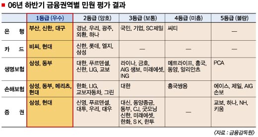 카드사는 부동의 1위인 비씨카드와 현대카드가 1등급. 특히 현대카드는 가입회원이 큰 폭으로 성장하고 있는데도 불구하고 민원이 큰 폭으로 줄어들고 있는 점이 특이하다. 삼성카드가 삼성그룹의 증권·보험과 달리 2등급으로 처져서 눈길을 끈다. 카드사들은 부실채권이 정리단계에 이르러 불법추심들이 줄어드는 등으로 민원건수가 지난 6개월전에 비해 26.5% 줄었다.