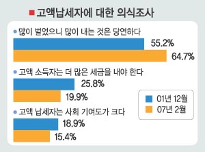반면 고액 납세자를 “사회 기여도가 큰 사람”으로 보는 긍정적 평가는 15.4%에 불과했다. 나머지 19.9%는 “고액 납세자가 세금을 더 내야 한다.”고 밝혔다. 또한 “세금을 축소 보고하는 것을 얼마나 용인할 수 있느냐.”는 질문에 과반인 55.2%가 절대 용인할 수 없다고 밝혔다. 조세연구원 관계자는 “이같은 결과는 종부세 납세 대상자를 빼고는 상당수가 별다른 이의를 제기하지 않는다는 점을 시사한다.”고 평가했다.