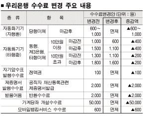 우리은행은 시중은행 최초로 영업시간 외 당행이체 자동화기기 이용수수료를 면제하는 등 다음달 2일부터 각종 수수료를 면제·인하한다고 28일 밝혔다.