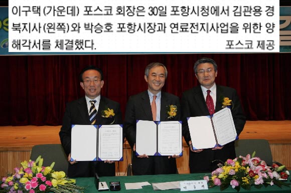 포스코는 30일 “차세대 성장산업의 하나로 연료전지사업을 본격 추진하기로 하고 이날 경북 및 포항시와 양해각서(MOU)를 체결했다.”고 밝혔다.