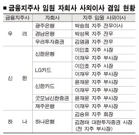지주회사 임원이 자회사 사외이사로 임명되는 것은 금융업계에서는 ‘악습’으로 굳어 있다. 신한지주는 신한은행과 신한카드, 굿모닝신한증권, 제주은행 등에도 이인호 사장 등을 사외이사로 내려보낸 상태다. 또한 우리금융 박성목 전무 등은 경남은행과 우리투자증권에, 하나지주 김승유 회장은 하나은행 사외이사로 활동하고 있다.