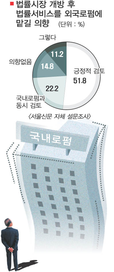 서울신문은 10일 국내 27개 그룹(공기업 포함)의 법무팀을 대상으로 ‘법률서비스 시장 개방에 대한 기업 법무팀의 입장 조사’란 자체 설문조사를 실시한 결과 기업의 63%가 법률 업무를 외국로펌에 맡기겠다고 응답했다.