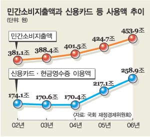 신용카드 소득공제가 처음 도입됐던 1999년의 카드 사용액은 42.6조원, 전체 민간소비 중 비율은 15.5%에 불과했다. 이후 카드대란이 일어나기 직전인 2002년 174.0조원(45.7%)까지 급격히 늘어났지만 거품이 빠지면서 2004년까지 금액과 비율이 조금씩 하락했다.