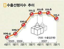 전기대비 상승률도 2006년 3분기 0.9% 이후 4분기 0.1%, 올 1분기에 보합을 기록한 이후 2분기에는 -0.4%로 하락 전환했다. 수출선행지수는 수출에 영향을 미치는 국내외 변수들을 이용해 수출 증감 정도를 예측할 수 있는 지수.2000년 1분기를 100으로 평가한 후 비중에 따른 가중 평균을 통해 산출한다. 일단 100을 넘었기 때문에 여전히 수출 성장세가 관측되지만 증가율이 점차 완만해지고 있다는 의미다.
