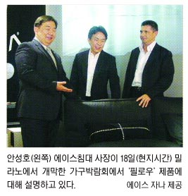 안성호 에이스침대 사장의 얘기다.‘침대 브라더스’로 유명한 안성호 사장과 안정호 시몬스침대 사장. 이들이 지난해 유럽 공략을 위해 함께 세운 이탈리아 현지법인인 ‘에이스 자나(ZANA·요람이란 뜻)’는 18일(현지시간) 개막한 밀라노 국제 가구 박람회 메인 전시장에 국내 가구업계에서는 처음으로 깃발을 꽂았다. 지난 1996년 부친인 안유수 회장이 이 박람회 참가를 위해 뛰어다녔지만 뜻을 이루지 못했다.