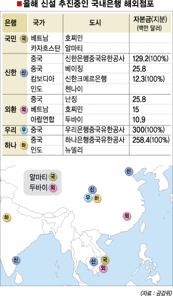 시중은행들은 올해 해외진출 계획을 화려하게 세웠다. 해외점포 31곳을 신설하고, 이중 중국에 8개, 인도에 5개, 베트남에 4개 등을 낼 예정이다. 좁은 국내에서 출혈경쟁을 하느니, 넓은 해외로 나가서 맘껏 이윤을 내자는 것이다. 금융감독 당국도 적극 도와주겠다며 등을 떠밀고 있다.