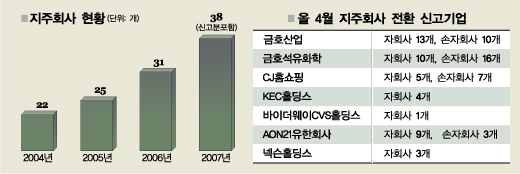 지주회사 체제로 지배구조를 바꾸려는 대기업들의 움직임이 확산되고 있다. 자산 순위 4위인 LG그룹이 이미 지주회사 체제로 바꾼 데 이어 3위인 SK그룹은 지주회사 전환 절차를 밟고 있는 가운데 금호아시아나그룹과 CJ그룹이 지주회사 전환을 신고했다.