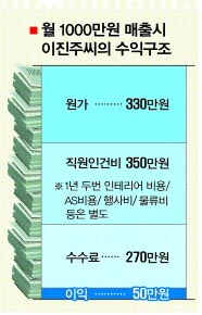 최씨는 예상치 못했던 인테리어 비용을 3500만원이나 지출했다. 백화점에 내야 하는 수수료는 매출의 37%나 됐다. 백화점 행사 협력 등의 명목으로 이런저런 경비가 계속 늘어났다.100만원짜리 옷 한 벌을 팔면 40만원쯤이 백화점에 들어갔다. 자신에게 남는 것은 5만원쯤에 불과했다. 백화점이 8배의 이익을 챙긴 것이다. 최씨는 “할당된 매출이 차지 않자 봄·가을에 두 차례씩 저가의 기획상품전을 강요당했다.”고 말했다.