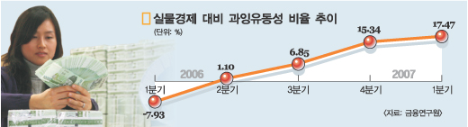 정부가 지난해 말부터 부동산담보대출을 억제하는 등 유동성을 죄기 위해 안간힘을 썼지만 지난 7개월 동안 유동성이 100조원 가까이 폭증했다. 실물경제 대비 과잉유동성 비율이 올해 1분기에 17.47%에 이른다. 최근 부동산 담보대출 증가율은 0%대로 줄었는데, 왜 그럴까. 우리 경제에 약일까, 독일까.
