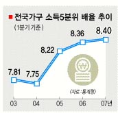 통계청이 9일 발표한 ‘2007년 1분기 가계수지 동향’에 따르면 2인 이상 전국 가구 중 소득 상위 20%(5분위) 가구의 월 평균 소득은 698만 4000원으로 1년 전보다 8.2% 증가했다. 반면 소득 하위 20%(1분위)의 월평균 소득은 83만 1000원으로 1년 전보다 7.8% 느는 데 그쳤다.
