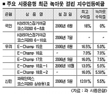지수연동예금은 말 그대로 코스피200 등 각종 증시 지수와 연계된 상품. 그러나 고객들은 1997년 외환위기 직후와 같은 증시 폭락기 때 대규모 손실을 볼 수 있다.