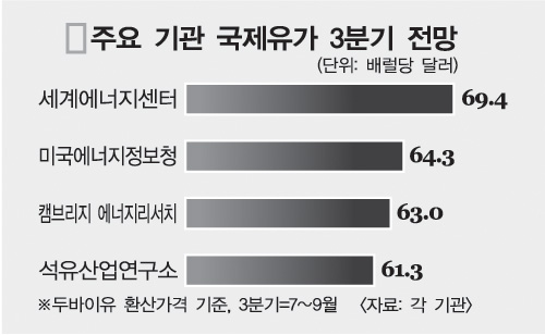 정부는 이날 이재훈 산업자원부 2차관 주재로 서울 반포동 팔래스호텔에서 민·관 유가동향 긴급 점검회의를 열었다. 이 자리에서 전문가들은 국제유가(두바이유)가 올 하반기 배럴당 65달러 안팎의 높은 수준에서 움직일 것으로 내다봤다. 자칫 70달러대까지 치솟을 수 있다는 우려도 나왔다.