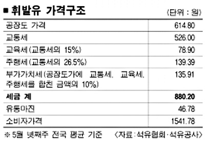 현재 휘발유 소비자가격의 약 60%가 세금(880.2원)이다. 세금 비중이 거의 세계 최고 수준이라는 것은 새삼스러운 얘기가 아니다.