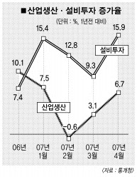 설비 투자도 15.6% 늘었다.1월 11.3%,2월 12.8%에서 3월 7%로 뒷걸음쳤다가 4월에 크게 뛰었다. 특수 산업용 기계와 사무용 기기 등의 호조에 힘입었다. 다만 기계수주는 비제조업 부문의 발주 둔화로 0.9% 증가하는 데 그쳤다. 국내 건설기성은 6.3%, 건설수주는 48.9%나 급증했다. 향후 경기 국면을 예고하는 지난해 같은 기간과 비교한 선행지수도 3월보다 0.3%포인트 나아졌다. 현재의 경기를 반영하는 동행지수 순환변동치는 100.6으로 3월보다 0.1포인트 상승했다. 제조업 가동률은 82.3%로 3월의 81.4%보다 0.9%포인트 올라갔다.
