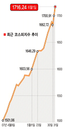 연일 사상 최고가 행진이 이어지면서 시중자금이 주식시장으로 몰리고 있다. 전문가들은 주가가 단기간에 너무 가파르게 올라 이르면 다음주나 이달 중순쯤 조정을 받을 것으로 내다봤다. 코스피지수가 1700을 돌파하자 망설이던 개인투자자들이 뒤늦게 가세, 과열양상을 보이고 있다. 그러나 전문가들은 ‘묻지마 추격 매수’는 금물이라고 경고했다.