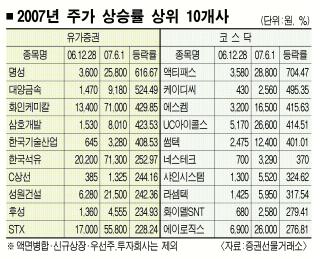 증권선물거래소에 따르면 올 들어 지난 1일까지 코스피지수가 19.64% 급등하는 동안 유가증권시장 상장종목 857개(거래정지 종목 제외) 가운데 161개는 지난해 말보다 주가가 오히려 후퇴했다. 다섯 종목 중 한 종목꼴이다.