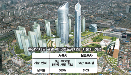 이견은 또 있다. 용적률이다. 철도공사는 610%를 제안했다. 서울시는 580%로 낮추라고 한다. 용적률이 낮으면 개발이익이 그만큼 줄어든다. 서울시는 그러나 “용적률 580%는 2001년 지구단위계획을 세울 때 결정됐다.”고 밝혔다.