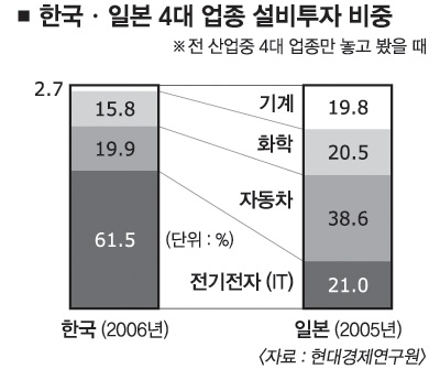 지난해 전기전자·자동차·화학·기계 등 국내 4대 업종에서의 설비투자를 분석한 결과 전기전자가 전체(4대 업종)의 61.5%를 차지했다. 그러나 자동차와 화학은 각각 19.9%와 15.8%로 크게 낮았고 기계는 2.7%로 극히 미미했다. 반면 일본은 자동차가 38.6%로 가장 높았고 전기전자(21.0%), 화학(20.5%), 기계(19.8%)가 각각 20% 안팎의 고른 분포를 보였다.