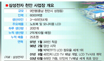 천안사업장은 컴퓨터와 모니터용 LCD가 주력 생산품이지만 57인치용 TV 패널도 생산하고 있다.LCD는 삼성전자에서 반도체와 휴대전화에 이은 신수종 사업이다. 천안사업장은 LCD부문 ‘맏형’ 노릇을 하고 있다.