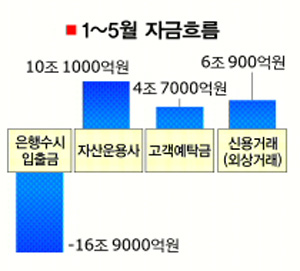 한국은행에 따르면 1월부터 5월까지 은행들의 수시입출금계좌에서 빠져나간 자금의 규모는 16조 9000억원이다. 요구불예금도 3조 7000억원이 감소했다. 은행측에서는 이 자금들이 최근 인기를 모으고 있는 증권사들의 CMA계좌로 이동한 것으로 관측하고 있다. 이같은 급속한 자금이동에 대해 시중은행장들은 지난 15일 한국은행의 5월 금융협의회에 참석해 “재원조달을 위해 양도성예금증서(CD) 등에 의존하게 될 것”이라고 입을 모았다.1∼5월에 CD발행액이 12조 9000억원에 이르렀다. 은행들이 자금조달을 CD발행이나 은행채에 의존하게 될 경우 대출금리 상승을 유발하게 된다. 올해 정책콜금리가 10개월째 동결됐는데도 대출금리가 급등해 서민들이 고통받은 것은 은행의 CD발행 탓이다. 은행에서는 자금이 빠져 나가지만 주식시장에는 쌓이고 있다.5월까지 주식형 펀드에 9조원이, 신종펀드에 13조 5000억원이 들어가는 등 자산운용사의 잔액이 10조 1000억원이나 늘었다.