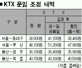 열차 종류별로는 KTX가 6.5%, 새마을호 3.5%, 무궁화호는 2.5% 인상된다. 서민들의 부담을 줄이기 위해 출·퇴근용 통근열차는 운임조정에서 제외했다. 이에 따라 서울∼부산간 KTX 요금은 현행 4만 8100원에서 5만 1200원으로 3100원, 용산∼목포는 4만 700원에서 4만 3300원으로 2600원 오른다.