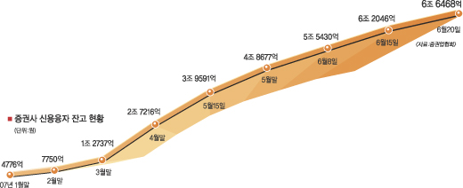 지난 3월말 1조 2737억원이던 신용융자잔고가 두달 반 사이에 5배로 불어났다. 신용융자잔고가 총거래대금(12조 4482억원)에서 차지하는 비중도 절반에 달한다. 이같은 급증세는 지난달부터 미수거래가 사실상 금지되면서 증권사들이 신용거래 조건을 완화한 것도 한 원인이다.