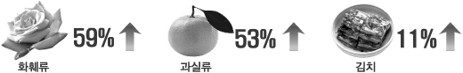 품목별로 보면 화훼류와 과실류, 김치가 이같은 수출 호조를 견인했다. 화훼는 중국 시장의 수요 회복으로 59.6%, 과실류는 53.5% 증가했다.