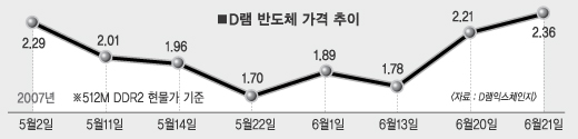 22일 업계와 타이완 온라인 반도체 중개업체인 D램익스체인지 등에 따르면 D램 반도체의 주력 제품인 512메가비트(Mb) DDR2 현물가격이 전날 평균 2.36달러를 기록했다. 지난달초까지만 해도 2달러 초반에서 거래되던 이 제품의 가격은 한때 1.70달러까지 급락한 뒤 1.8달러 안팎에서 횡보해왔다.