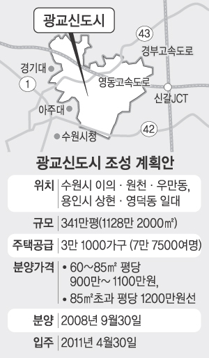 택지공급 및 조성공사는 올 9월부터, 분양은 내년 9월부터 각각 시작되며 입주는 2011년 4월쯤 개시된다. 김 지사는 “광교신도시는 “서울 강남역까지 30분 만에 갈 수 있는 전철과 도로 등을 갖춘 값싸고 품질 좋은 명품신도시로 건설될 것”이라고 말했다.