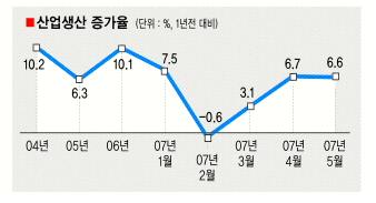 28일 통계청이 발표한 산업활동 동향에 따르면 5월 중 산업생산 증가율은 1년전보다 6.6% 증가했다.4월의 6.7%보다 1%포인트 낮다. 하지만 1·4분기 평균 산업생산 증가율 3.3%보다는 2배에 이른다.