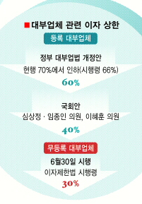 그러나 제도권인 저축은행으로서는 더 신경쓰이는 법이 있다. 오는 7월 임시국회에서 통과될 수도 있는 ‘대부업법 개정안’이다. 재정경제부에서는 대부업법 개정안에서 현행 70%인 이자상한을 연간 60%로 낮춰서 발의했다. 시행령의 이자상한은 이보다 더 낮은 40∼50%가 될 것으로 예상되고 있다.
