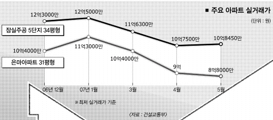 또 재건축을 추진중인 서울 송파구 잠실주공 5단지 31평형은 지난달 10억 8450만∼10억 9000만원에 거래됐다. 지난해 12월 12억 3000만∼13억 6000만원이었던 이 아파트 실거래가는 4월 10억 7500만원까지 떨어졌다.5월에 다소 오름세를 보였다.