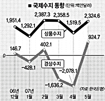 올 들어 경상수지는 1월 4억 3000달러 적자로 출발한 후 2월에 4억달러의 흑자로 돌아섰다.3월에는 16억 4000만 달러 적자로 반전됐으며 4월에는 1997년 외환위기 이후 10년 만에 최대인 20억 8000만달러 적자를 기록했다.