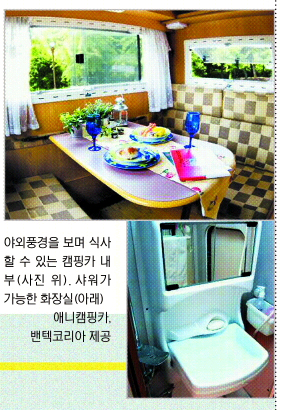 캠핑카의 매력은 뭐니뭐니해도 이동과 숙박을 동시에 해결할 수 있다는 점이다. 호텔·콘도·민박과 야영의 중간 형태인 셈이다. 캠핑카 내부에는 침대·소파·화장실은 물론이고 싱크대·전자레인지·냉장고·에어컨·TV 등 다양한 편의시설들이 갖춰져 있다. 옷장·신발장 등 수납공간도 있다. 공간은 2∼3평 수준이지만 거실 겸용 주방 등 공간 활용도를 극대화해 실용적으로 배치했기 때문에 실제 느낌은 이보다는 넉넉하게 느껴진다.