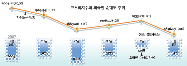 박찬익 모건스탠리 리서치센터장은 “글로벌 자본의 리스크 선호도가 줄어들고 있고 우리나라 주식시장에서 단기간 내 추가 조정이 불가피하다.”고 진단했다. 실제 외국인은 7월 한달 동안 우리나라 주식시장에서 4조 8322억원어치 주식을 순매도했다.